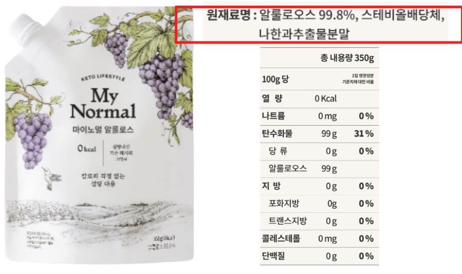 : 성분은 "유기농" 알룰로스 100%. 첨가물 없이 좋은 제품입니다.