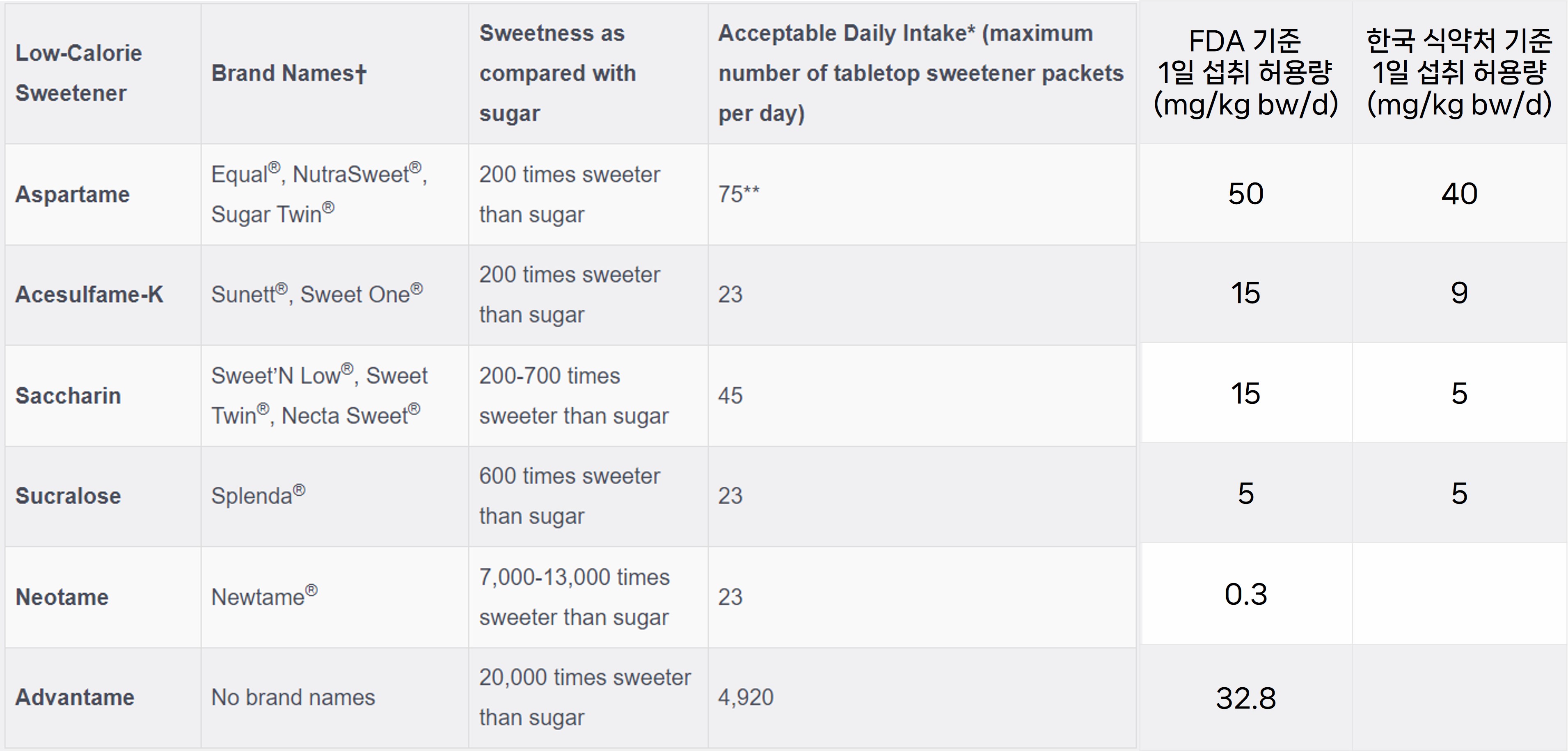인공 감미료는 자연에 존재하지 않는 화합물로, 화학적 합성을 통해 인위적으로 만들어지는 화합물입니다. 칼로리 없이 단 맛을 낼 수 있어, 대부분의 다이어트 탄산음료와 껌, 요구르트, 제과류 등 많은 무설탕 제품에 들어갑니다. 모두 FDA와 한국 식약처의 승인을 받은 물질로 대체적으로 안전하다고 여겨집니다.