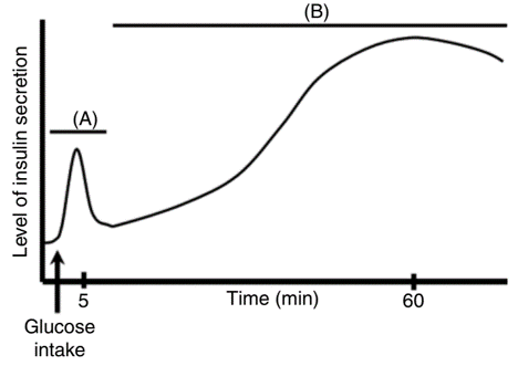 인슐린 분비는 두 단계로 일어납니다(그림 1). 첫 번째 단계는 초기 5~10분에 일어나는 비교적 낮은 인슐린 피크로 ATP 민감성 K+ 채널(K+ATP-sensative channels)에 의존적인 포도당 자극성 인슐린 분비가 일어납니다. 두 번째 단계는 30~60분이 넘는 훨씬 더 지속적이고 많은 양의 인슐린이 분비되는 단계로 K+ATP-비의존적인 포도당 자극성 인슐린 분비에 의해 조절됩니다. 따라서 두 번째 단계는 대사 자극과 인슐린 분비의 연동이 더 중요한 조절 인자라고 할 수 있겠습니다.