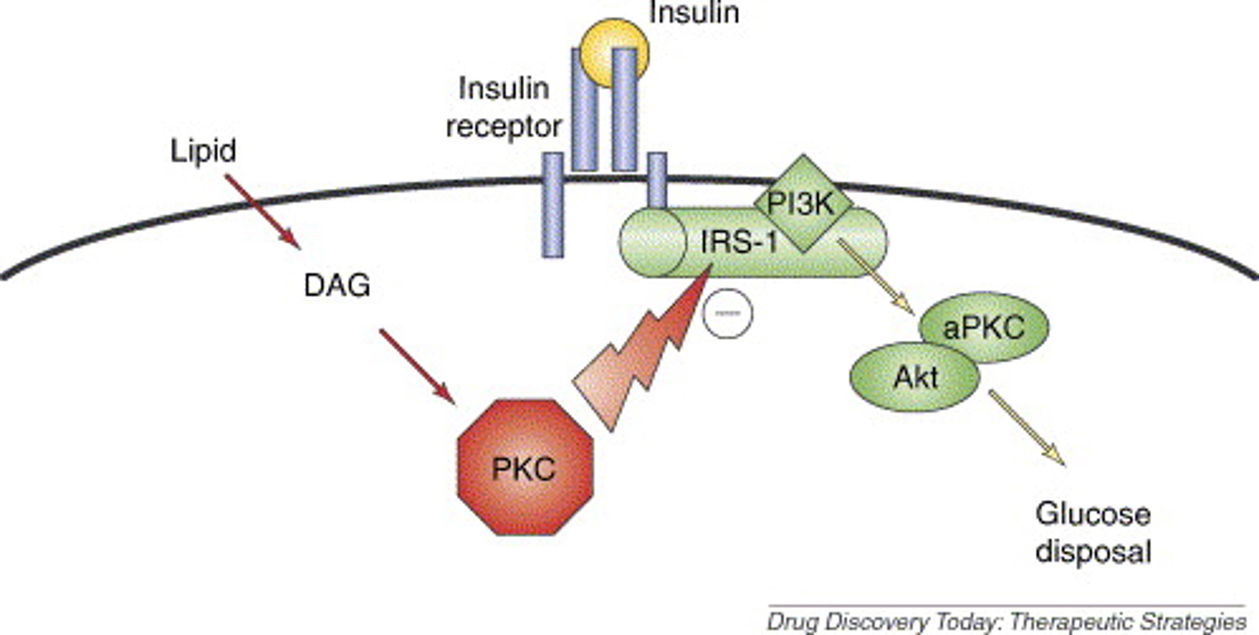 보통 지방이 축적되지 않아야 할 근육 및 간에 축적된 지방을 이소성 지방(ectopic lipid)이라고 부르는데요. 이처럼 잘못 축적된 지방은 근육이나 간의 디아실글리세롤(diacylglycerol, DAG) 수치를 증가시켜, 단백질 카이네이스 C(protein kinase C, PKC) 계열의 활성화를 유도하여, 인슐린 저항성을 일으킵니다 (근육은 PKCθ, 간에서는 PKCδ 와 PKCε). 이는 PKC가 IRS(insulin receptor substrate, 인슐린 수용체 기질)의 세린 잔기를 인산화하기 때문인데요.