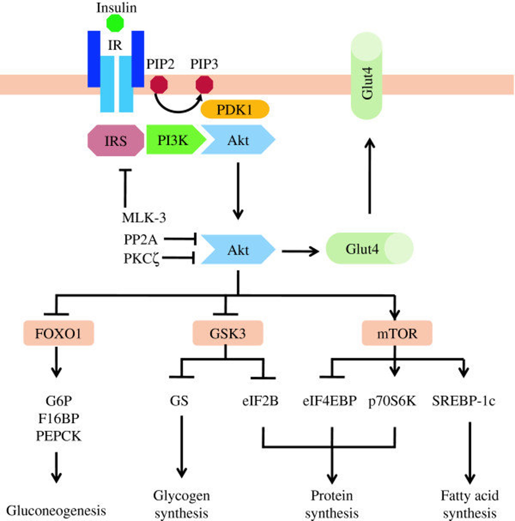 인슐린 저항성을 이해하기 위해 우선 정상적인 경우에 인슐린이 표적 세포에서 어떻게 작용하는지 알아보도록 하겠습니다 (그림 1). 인슐린이 표적 세포의 인슐린 수용체에 결합하면서 세포 내 신호 전달이 시작되는데, 이는 인슐린 수용체가 티로신 키카이네이스이기 때문입니다. 즉, 인슐린이 수용체에 결합하면, 인슐린 수용체 티로신 카이네이스(insulin receptor tyrosine kinase)가 활성화되어, 인슐린 수용체 기질(insulin receptor substrate, IRS) 중 특히 IRS1, IRS2를 인산화(phosphorylation)시킵니다. 이러한 인산화된 IRS 단백질은 세포 내 신호 분자와 결합하고, 이를 활성화하는데, 그 중 포스파티딜이노시톨 3-카이네이스(phosphatidylinositol 3-kinase, PI3K)가 가장 중요한 것으로 알려져 있습니다. PI3K가 활성화되면, 포도당 수송체 4형(glucose transport type 4, GLUT4)를 세포막으로 이동시켜 근육으로 포도당의 흡수를 촉진하고, 전사 인자(transcription factor)인 포크헤드 박스 단백질 O1(forkhead box protein O1, FOXO1)을 인산화 및 비활성화하여 다운스트림 유전자의 발현을 조절합니다. 인슐린은 또한 RAS-mitogen-activated protein kinase(MAPK) 경로도 자극합니다.