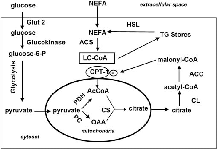CPT 활성과 TCA/말로닐-CoA 대사는 β-산화의 조절과 밀접한 관련이 있습니다. 탄수화물이 NEFA보다 많을 때, malonyl-CoA에 의해 CPT가 직접 억제되는데, 말로닐-CoA는 아세틸-CoA 카르복실레이스(acetyl-CoA carboxylase, ACC)에 의해 TCA 사이클의 중간 산물인 시트르산(citrate)으로부터 생성됩니다. CPT가 억제되면 β-산화에 의해 지방이 이용되지 못하므로, 세포질에 지방이 축적되어 인슐린 분비를 촉진할 수 있는데 그 기전은 다음과 같습니다. 1) 조절 이온 채널 단백질의 활성을 변화시키고, 2) Ca2+ 유입을 증가시키며, 3) LC-CoA 및 다이아실글리세롤(diacylglycerol, DAG)과 같은 인슐린 자극성 지질을 생성하고, 4) 세포막과 인슐린 소포의 상호작용을 증가시켜 인슐린 분비를 증가시킬 수 있습니다.